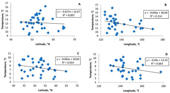 Scatterplots of diurnal temperature range (DTR) vs. latitude (A,C) and longitude (B,D) for locations in the Russian Far East for the period 2000–2019; (A,B) continental weather stations, (C,D) maritime weather stations. Black solid line is plotted as the least-square linear regression.
