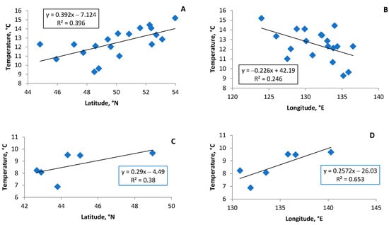 Figure 2 provides details of the relationship between DTR and both latitude and longitude, separately for continental and maritime weather stations. While DTR ranges from 9 to 16 °C at continental weather stations (Figure 2A,B), it has much lower values at the coastal locations, varying from 4 to 11 °C (Figure 2C,D). No obvious dependence of DTR from latitude and longitude was found, which is confirmed by a low coefficient of regression and an almost complete absence of the slope of the black solid lines. Figure 3 shows this relationship for the southern part of the RFE, and here the dependence is higher in comparison to the entire study area, both for continental and maritime zones; thus, the further north, or deeper into the continent and further from the coastline, the stronger the relationship of DTR with latitude (Figure 3A,C) and longitude (Figure 3B,D). The highest dependence is shown for the relationship between DTR and longitude at locations with maritime climates (Figure 3D); since in this part of the RFE the coastline runs from southwest to northeast, an increase in longitude along the seashore means rapid DTR growth from south to north.
