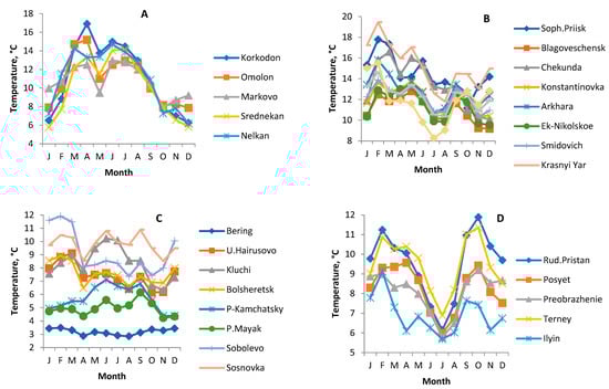 The intra-annual changes in DTR have a large variety, with differences between maximum and minimum monthly DTR during the year ranging from 0.6 °C in Bering Island to 10.4 °C in Korkodon, both located further to the north in maritime and continental climates, respectively. As a whole, the difference is higher for continental locales in comparison to those near the shoreline. In the course of the year, the maximum DTR is detected in February–March for many continental weather stations, switching to April–May for some locations in the north, and with the second peak in September–October. Minimum values are found in both January, for almost all locations, and in July–August at southern weather stations. The coastal area in the south shows an obvious annual course with the minimum in July and two peaks in February and October. Figure 4 gives a thorough picture for several locations at the RFE, showing monthly changes in DTR at continental weather stations vs. coastal, and northern locations vs. southern. The DTR peak in April for continental locations in the north (Figure 4A) is probably due to the rapid spring increase in daytime temperature (Tmax) compared to nighttime temperature (Tmin), which is very obvious at the continent, and cannot be detected near the sea line (Figure 4C). The DTR drop in May (Figure 4A) may be caused by the continued seasonal warming and an increase in both Tmax and Tmin.