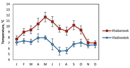 Figure 5 shows the details for Khabarovsk vs. Vladivostok, as follows: in continental Khabarovsk, DTR ranges from 7.0 to 11.7 °C, in comparison to coastal Vladivostok, where DTR seasonally changes from 5.5 to 8.0 °C. At both weather stations, maximums are found in spring, specifically in May, but with a much higher value in Khabarovsk; minimum DTR are recorded in December–January for Khabarovsk and in summer for Vladivostok. The second peak in DTR in a yearly course is observed in autumn, in September for Khabarovsk (10.2 °C) and in October for Vladivostok (7.1 °C). These patterns can be explained by the different effects of monsoons throughout the year in continental and coastal areas [38,39]. The cold and relatively stable weather caused by winter monsoons changes in spring. The higher variations in DTR are found in May, due to the transfer of the monsoon from the winter stage to the summer. The summer monsoon behaves differently in two locations; during all summer months, DTR is relatively low in coastal Vladivostok in comparison to continental Khabarovsk. In Vladivostok, cool and changeable weather in June is replaced by very stable warm and hot temperatures in the period from July to August (Figure 5). In autumn, the monsoon moves again from the summer stage to the winter, but with a delay in Vladivostok due to the influence of the Pacific Ocean; the October peak for DTR in Vladivostok is comparable to September in Khabarovsk [40]. Figure 5 shows details of intra-annual DTR changes for the capital cities of Khabarovsk and Vladivostok. Not only the monthly DTR, but also its day-to-day variations are the highest in spring–early summer; the values of the standard deviation reach a maximum in the period from April to June in Khabarovsk, and in June in Vladivostok.