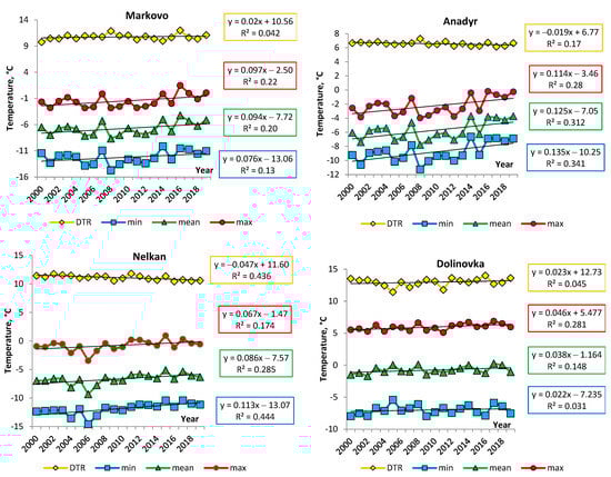 Temporal dynamics of minimum, mean, maximum air temperatures, and DTR, for several weather stations at the RFE during the study period from 2000 to 2019. Black solid lines show the linear trend of the correspondent series.