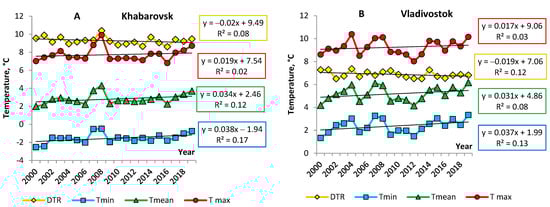 Temporal dynamics of minimum, mean, maximum air temperatures, and DTR, in capital cities of the RFE: Khabarovsk (A) and Vladivostok (B), during the study period from 2000 to 2019. Black solid lines show the linear trend of the correspondent series.
