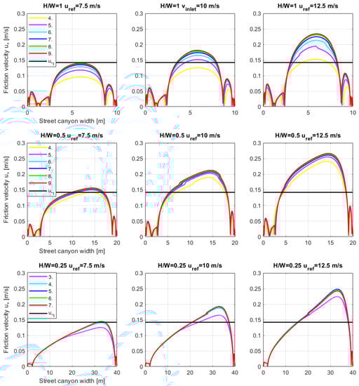 It is evident from Figure 2 that some configurations are missing. The geometrical configuration with H/W = 2 is not displayed here. This is because in no flow regime, even with = 12.5 m/s, did the value of exceed . The values were not even close to the threshold friction velocity. The shape of the friction velocity profile in the street canyon for H/W = 2 was similar to the other cases. What is also missing are the flow regimes with = 5 m/s. In those cases, the value of did not exceed . For all the configurations, starts exceeding the for = 7.5 m/s, however, not in all the canyons. In the cases where was not exceeded, the evaluation of resuspension was not possible. These cases are not further evaluated.