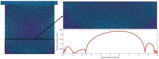 Detailed view of the bottom of the street canyon (H/W = 1, = 12.5 m/s, 6th canyon), where the vortexes and the corresponding friction velocity are visible.