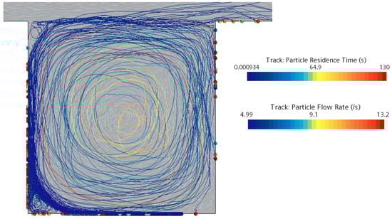 The velocity at a 2 m height in the simulations was higher than the velocity reported by studies [,,]. Therefore, the particle source is set correctly. The velocities inside the street canyon were in the velocity interval where resuspension should be evident. The strength of the source can be validated too. With an increasing wind speed, the amount of particles should increase exponentially. However, for each case, only two flow regimes were computed. More flow regimes would be needed to validate the source strength. Additionally, a 3D simulation would need to be performed. Particle tracking would be very difficult to validate in real environments. There are many sources of particles, in addition to resuspension. This is further discussed in the following chapter.