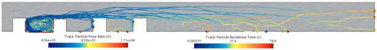 Particle dispersion and deposition inside the street canyon (H/W = 1, ). The points on the street canyon surfaces represent the deposited parcels (particles) with a different mass (or number of particles). The lines represent particle tracks. On these lines, the particle residence time is displayed.