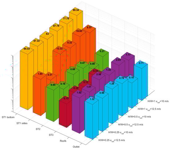 It is evident that most of the particles are deposited on the ground of the first street canyon. The particles released from the parts where has a lower value are also showing the minimal residence time. The second highest value of the deposited particles is on the sides of the street canyon. A significant amount of particles are also deposited on the roofs and the outer region. Fewer particles made it to the second and third street canyon. With an increasing wind speed, more particles are dispersed outside the surface. Additionally, more particles are deposited on the sides, the second street canyon, roofs, and the outer region. An exception is the configuration H/W = 1, where with an increasing wind speed, the amount of particles in the second canyon and the outer region decreases. This shows that, in almost every case, a higher wind speed causes better ventilation of the canyon. Ventilation can be expressed as the amount of particles (here, originated in resuspension) leaving the first street canyon. This was also confirmed by []. More interesting are the results of the geometric configurations. A more open street canyon should be better ventilated. In connection with resuspension, the opposite is true. The H/W = 0.25 configuration has the highest number of particles deposited on the street canyon ground. It also has the lowest number of particles deposited to the sides of the canyon. Overall, H/W = 1 has the worst ventilation. On the other hand, the H/W = 0.5 configuration is ventilated the most. In terms of the total particle concentration, the worst case is where the largest amount of particles is released. This case is the H/W = 0.25 configuration, where the surface available to resuspension is the greatest. The particles which originated in the resuspension remain dominant in the first street canyon. The ventilation rate of the first street canyon ranges from 2.09–4.67%.