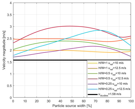 Velocity magnitude at a height of 2 m in all the simulated cases, above the surface where was exceeded. For the purpose of comparison, the source width is expressed as a percentage.