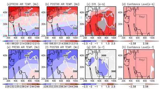 This study analyzes the periods 1982–1998 (hereafter PRE99) and 1999–2017 (hereafter POST99) separately because of the recognized dramatic changes in global and regional temperatures before and after 1999 [,,,]. Interestingly, these distinctions were reported to have affected the convection pattern before and after 1999 []. Figure 1 shows the May–June (MJ) averaged TT for the periods PRE99 (a,e) and POST99 (b,f) at 100 hPa and 250 hPa, respectively. The difference (here, a,b) is illustrated in Figure 1c, and a Student’s t-test was used to determine its statistical significance (Figure 1d). Similarly, Figure 1g,h correspondingly indicates the differences (here, Figure 1e,f) and their statistical significance. In short, MJ PRE99 − POST99 is observed to be significantly different from zero at the 99% confidence level based on a Student’s t-test (Figure 1d,h). It is exhibited that throughout the PRE99 and POST99 periods, there was a significant change in TT at 250 hPa and 100 hPa. Positive anomalies at 100 hPa and negative anomalies at 250 hPa (the region’s Long. = 54° E–85° E, Lat. = 22° N–38° N; hereafter Vertical Thermal Contrast region or Region I), respectively, reveal a precise vertical dipole structure over Central Asia (Figure 1c,g). Unambiguously, over the two separate periods, the air temperature at 100 hPa and 250 hPa changed by around 2.5 K and 1 K, respectively. PRE99 minus POST99 cases were shown to have a much warmer/colder upper troposphere at 100/250 hPa (Figure 1c,g), whereas POST99 minus PRE99 displays the reverse structure (Figure not shown). Remember that the case POST99 minus PRE99 is essentially the reverse case of PRE99 minus POST99, which is why we have refrained from showing the figure for the case POST99 minus PRE99 throughout the paper, although a discussion of it was unavoidable. The anatomy in Figure 1 supports the striking difference between the upper thermal contrast in PRE99 and POST99.