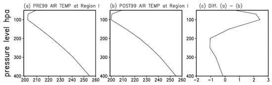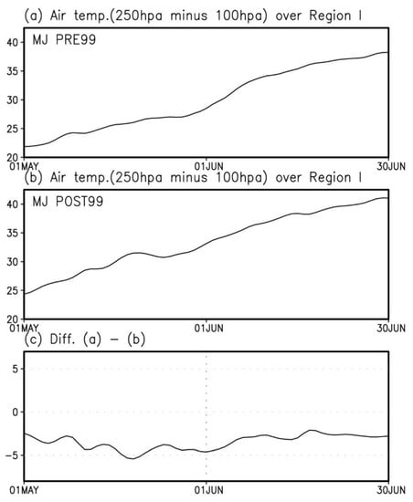 MJ (250 hPa–100 hPa) air temperature over Region I for (a) PRE99 and (b) POST99. (c) The difference between (a,b), or (a) − (b).