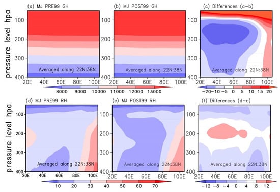 Vertical variation in the geopotential height over the latitudinal band 22° N–38° N (a) PRE99 and (b) POST99. (c) The difference between (a,b), that is, (a) − (b). (d–f) as in (a–c), but for relative humidity.