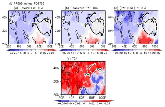 (a) The top of atmosphere MJ mean upward LWF (Wm−2) during PRE99 − POST99, (b) as in (a), but for downward SWF; and (c) is the same as (a), but for LWF + SWF. (d) TCA fraction during PRE99 − POST99.