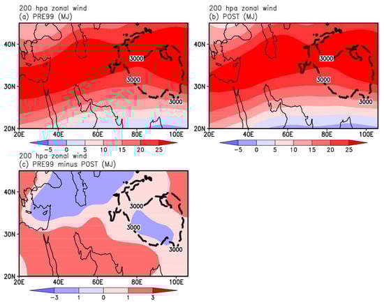 MJ zonal wind at 200 hPa (in m/s) (a) PRE99, (b) POST99, and (c) the difference between the two (i.e., MJ PRE99 − POST99). The 3000 m topographic isoline is shown by the dashed contour.