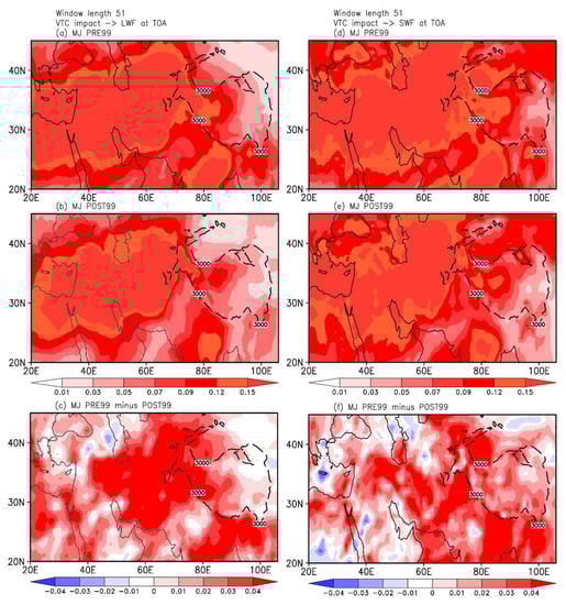 To strengthen the claim made, the direct relationship of the upper TT variation to LWF and SWF is investigated. The association is quantified using a recently created “composite causality analysis”. The causal patterns generated by various time window sizes, such as 41, 51, 61, and 71 days, were applied; however, the resulting causal patterns are similar. For more details on “composite causality analysis”, please refer to []. The results are presented in Figure 8. Causation from the upper TT thermal contrast to LWF and SWF at the top of the atmosphere is measured in nats/day. Nat is the unit for entropy, which has the form of ∫ρlogρ (ρ is the pdf; probability density function) when the base of the logarithm is e. The analysis demonstrated that the upper TT variation over the region I was identified to be significantly casual to LWF and SWF over the Central Asian region and the area to its west (Figure 8). It is critical to emphasize that the causalities discovered in this way are asymmetric in direction; specifically, they are derived from the upper TT thermal contrast to the LWF and SWF and are unrelated to those obtained from the other direction. This remarkable observation distinguishes the impact of the upper vertical TT thermal contrast over the region I on the convection changes in PRE99 and POST99.