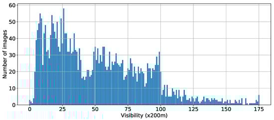 Visibility distribution of QVEData. (Note ×200 m denotes the unit of the x-axis. In other words, if , then the visibility is actually m = 5000 m.)