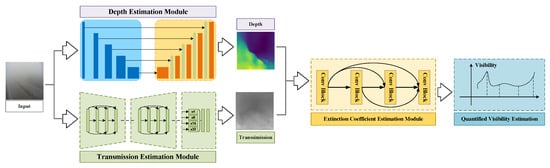 From Equation (7), the visibility V is highly correlated with transmission map t and scene depth d. This motivates us to design a network that is physically constrained by Equation (7). As a result, this paper proposes Deep Quantified Visibility Estimation network (abbreviated as DQVENet), an elaborately designed convolutional architecture, especially for single image-based quantified visibility estimation. The overall architecture can be found in Figure 2.