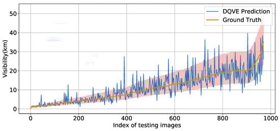 Figure 5 presents the DQVENet results and the groundtruth visibility observation on the testing set of QVEData. Specifically, the 971 testing images are first sorted from small to large according to their groundtruth visibility, i.e., the orange line. Then, the corresponding predictions are plotted along with the groundtruth, i.e., the blue line. Finally, we also present the soft gap, i.e., the red area, for better demonstrating the effectiveness of DQVENet. Except for some overestimated cases, DQVENet can fit the visibility well in general.