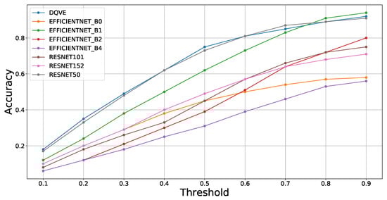 Classification accuracy of the proposed DQVENet and other compared methods under different thresholds.