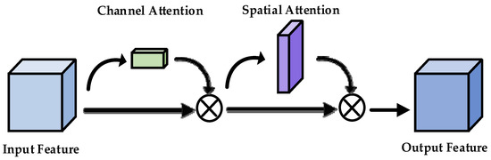 Spatial attention is concerned with which part of the space has meaningful features [44]. The spatial attention module performs the maximum and average pooling layers on the input features, respectively. The two resulting feature maps are reduced to one channel through a convolution layer. Next, the spatial weight coefficients are generated through the sigmoid layer and, finally, the final features are obtained after multiplying them with the input features.