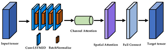 The model structure of DACLSTM is shown in Figure 2. We choose the ConvLSTM model to initially extract the temporal as well as spatial information of the data, plus the batch-normalization layer to scale the data and distribute them in the best classification interval of the activation function and repeat the combination of four sets of ConvLSTM and batch normalization. Next, we add a dual-attention mechanism, channel attention and channel attention, to allow the model to decide which parts need attention and allocate adequate information-processing resources to the critical components. Finally, we add a fully connected layer to allow the neurons in that layer to be fully connected to all neurons in the previous layer. The fully connected layer can integrate local information with category differentiation in the convolutional or pooling layers and reduce the number of our output-channel features to one layer.