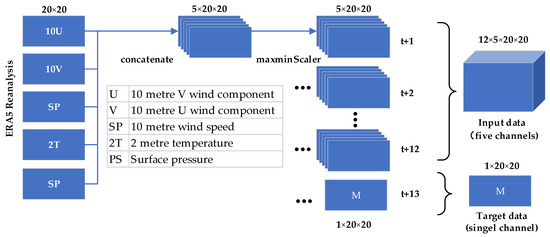 In this study, the ERA5 dataset mentioned above was selected as the model training and testing data. The data area is North China (32–37° N, 110–115° E) and is shown in the red box in Figure 3. In this region, which is located in a plain area, there is abundant wind energy, the wind field turbulence degree is low, and the wind speed and wind direction do not change rapidly due to obstacles or rough wind channels [48,49]. If the wind field turbulence degree is too large, this not only affects the output of the wind turbine, but also makes the wind turbine produce vibration and uneven load, reducing the service life of the wind turbine and, in serious cases, causes the paddle blade to fly out. We selected the data from 2019 to 2021 as the training set and the data from January to February 2022 as the test set. We also collected the data from January to February 2022 from the GRAPES_Meso3km model data as the comparison between the proposed model and the numerical weather-forecasting method for this paper. We selected five channels of data consisting of 2 m temperature, ground-level pressure, 10 m wind U-component, 10 m wind V-component, and 10 m wind speed absolute values. The absolute 10 m wind speed is calculated from the 10 m wind speed U and V components. The 10 m absolute wind speed and 2 m temperature and surface pressure are used as the primary channels, and 10 m wind speed U and V components are used as secondary channels. To reduce the problem of different data magnitudes for different channels, we used the minimum–maximum normalization method to map the dataset to between 0 and 1. We used the 12 previous hourly time steps as model input and the next time step as model output. Since ERA5 is 0.25 degrees and our selected area spans five latitudes and longitudes, we end up with a 20 × 20 grid of data. The data processing flow is shown in Figure 4.