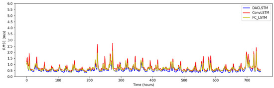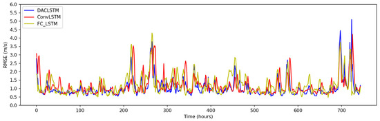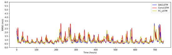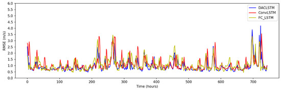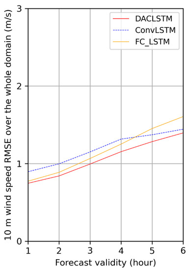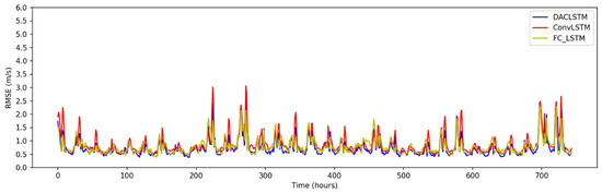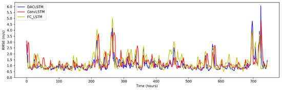 We calculate the RMSE separately for the six-hour-by-six-hour forecasts of the three different models on the test set (January–February 2022). In addition, we calculate hour-by-hour RMSE for different forecast times on the test set for January 2022. In order to compare the forecasting effectiveness of the model proposed in this paper with the GRAPES numerical weather-prediction model, the prediction results of the DACLSTM model were compared with the GRAPES_Meso3km model data in individual cases (on 9 January 2022 at 03:00).