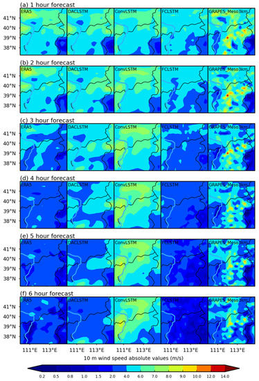 - Compared with the GRAPES_3KM numerical forecast of 10 m wind speed, the DACLSTM model can forecast the approximate distribution of wind speed fallout, and the numerical magnitude is also close to that of ERA5. For example, as shown in Figure 12, the 10 m wind speed forecasted by the DACLSTM model can basically agree with ERA5 in 1–2 h, while GRAPES_Meso3K forecasts higher values in the middle compared to the proposed model, which does not agree with ERA5. Within 2–6 h, ERA5 shows uniform wind speeds (2–4 m/s), and the proposed model accurately forecasts the mean value of 10 m wind speed of ERA5, while GRAPES_Meso3km still has higher values in the middle.