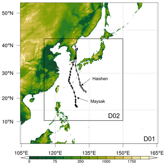 Terrain height (m, shading) and model domains for all the simulations. Typhoon marks represent the Regional Specialized Meteorological Center (RSMC) best tracks of typhoons Maysak and Haishen. Filled and unfilled stars represent the Geomundo and Tongyeong stations at 34.0° N 127.5° E and 34.4° N 128.2° E, respectively.