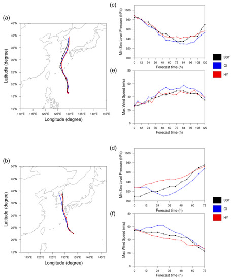 Simulated (a), (b) track; (c,d) minimum sea-level pressure (hPa; MSLP); and (e,f) maximum wind speed at 10 m (m s−1; MWS) for typhoons Maysak (initialized at 00 UTC 29 August 2020; five-day runs) and Haishen (initialized at 12 UTC 4 September 2020; three-day runs), respectively. Black: the Regional Specialized Meteorological Center (RSMC) best track (BST) data; blue: OI run; red: HY run.