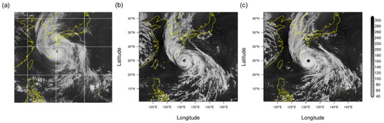 Typhoons are one of the most dangerous natural disasters to coastal regions. Strong winds, heavy rainfall, and storm surges, which are characteristic of strong typhoons, can cause huge socio-economic losses whether they occur separately or together [1,2,3]. Many previous studies have expected that sea surface temperature (SST), ocean heat content (OHC), atmospheric temperature, and water vapor, all of which affect typhoon activities, could be changed to favorable conditions for typhoon development or intensification under global warming [4,5,6]. In addition, even some recent studies projected that the possibilities of typhoon development and intensification at higher latitudes than in the past and moving northward to mid-latitudes would also increase [7,8,9]. Thus, there is an increasing need for research to reduce the damage caused by stronger and more active typhoons in the future.
