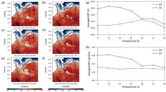 Horizontal distribution of SST (K, shading) in the (a,c,e) HYCOM and (b,d,f) OISST data from 12 UTC 4 September to 12 UTC 5 September 2020 at 12 h intervals. Time series of averaged (g) SST (K) and (h) upward moisture flux (g m−2 s−1; MFX) near typhoon Haishen from 00 UTC 5 September 2020 to 12 UTC 6 September 2020. Blue: OI run, red: HY run. Black marks represent typhoon location at that time.