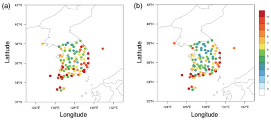 Figure 6 shows the maximum value of the MWS from the Korea Meteorological Administration (KMA) Automated Synoptic Observing System (ASOS) observation data for the 12 h periods centered on the times when typhoons Maysak and Haishen were closest to the Korean Peninsula (18 UTC 2 September 2020 and 12 UTC 6 September 2020, respectively). Since both typhoons passed through the southern part of the country and over the sea to the east of the peninsula, a very strong MWS was observed mainly along the south and east coast during the time directly affected by the typhoons. We evaluated the forecast performances of the two runs compared to all ASOS stations and the area where the wind from the typhoon was particularly strong. We used percent bias (PBIAS) to compare the overall results of the two runs. PBIAS measures the average tendency of the simulated values to be larger or smaller than the observed values. It can be calculated as follows (Equation (1)):