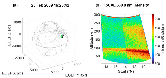 The main purpose of this study is to resolve the uncertainty in the airglow VER derived using the intensity conversion process, considering advanced applications requiring the usage of airglow VER, derived from satellites captured emission profiles that don’t converge to zero at their uppermost point, such as FORMOSAT-2/ISUAL (Imager of Sprites and Upper Atmospheric Lightning) 630.0 nm airglow images [18]. Figure 1 shows an example of ISUAL 630.0 nm airglow intensity that was captured at an orbital altitude of 891 km by the FORMOSAT-2/ISUAL at 16:26:42 UT, on February 25th during the 2009 solar minimum in the ECEF (Earth-Centered, Earth-Fixed) coordinates. In Figure 1a, the red star marks the position of the FORMOSAT-2, and the image right ahead of the FORMOSAT-2 is the 630.0 nm emission in Figure 1b, which can be considered as an integration of all VERs along the ISUAL’s line of sight within the field of view. The upper boundary of the 630.0 nm emissions is limited at about 300 km, as shown in Figure 1b, and the intensities at about 300 km are mostly larger than 400 Rayleighs. Under this premise, if the Abel inversion is applied and begins from 300 km, the whole retrieved VER profile will be significantly underestimated according to the assumption that the layers are spherically symmetrical.