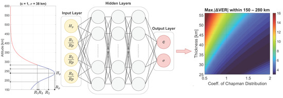 Illustration of deep learning training method. The left panel shows a profile of intensity as an example, while the middle panel demonstrates the input, hidden, and output layers of the artificial neural network. The partial Chapman distribution of the type coefficient (c) as 1, and thickness () as 38 km is in red, and the blue part indicates the observed Rayleigh. The right diagram shows an OSSE result, the maximum absolute difference of the model-derived VER (considered as ground truth data in OSSE), and the Abel retrieved VER in this case within 150–280 km with different sets of (c,). The altitude of the peak intensity () is denoted as , and the ratio of intensities at 290 km (), 280 km (), and 180 km () are selected as inputs. There are 3 hidden layers, and the outputs are c and .
