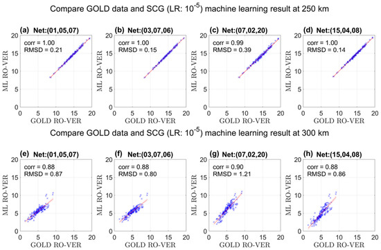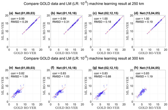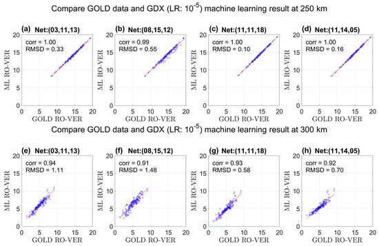 First, we randomly subsampled a set of 320 profiles out of 387,900 nonzero profiles of GOLD limb 135.6 nm intensity profiles in 2020 for filtering the performance of the nets quickly. We selected four top-performing nets trained with each algorithm based on the correlation coefficient and root-mean-square deviation (RMSD, unit: VER) [47] between the GOLD RO-VER and ML RO-VER trained with the algorithms GDX, SCG, and LM at 250 km and 300 km as shown in Figure 4, Figure 5 and Figure 6. Figure 4 shows the scatter plots of GOLD RO-VER and ML RO-VER at 250 km (Figure 4a–d) and 300 km (Figure 4e–h) applied with four top-performing GDX nets. For the RO-VERs at 250 km, it is apparent that the correlation coefficients approach 1.0 due to the 135.6 nm intensities at 250 km being covered by GOLD observations, as opposed to being derived using ML.