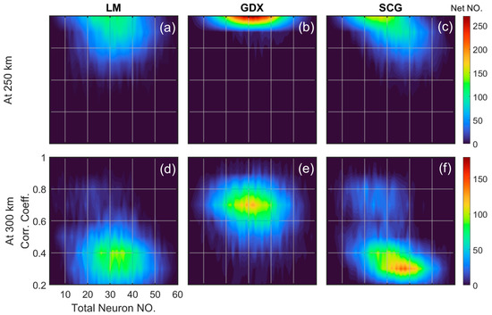 The relation between the number of nets with specific total neuron number in a net and the correlation coefficients of RO-VERs at 250 km (a–c) and 300 km (d–f) trained with LM, GDX, and SCG algorithms in alphabetical order.