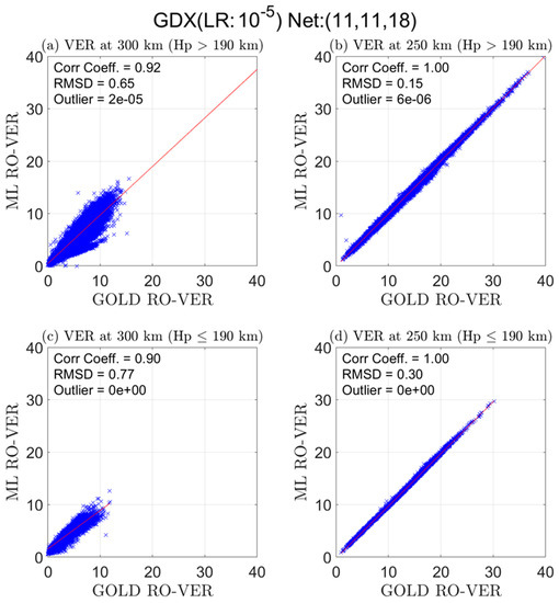 The scatter plots of the GOLD RO-VERs and ML RO-VERs applied with the GDX algorithm trained Net:(11, 11, 18) are compared in Figure 8 based on the altitudes, and the four groups are RO-VERs at 300 km when 190 km, at 250 km when 190 km, at 300 km when 190 km, and at 250 km when 190 km. Besides the expected results of the near-perfect correlation of the RO-VERs at 250 km altitude (Figure 8b,c), the correlation coefficients of the RO-VERs at 300 km altitude are high (≥0.90) and the RMSDs are low (<1.0) regardless of whether the initial was greater than 190 km or not (Figure 8a,d).