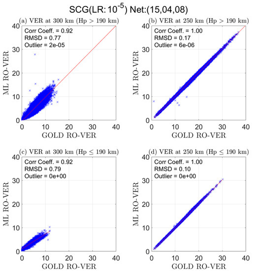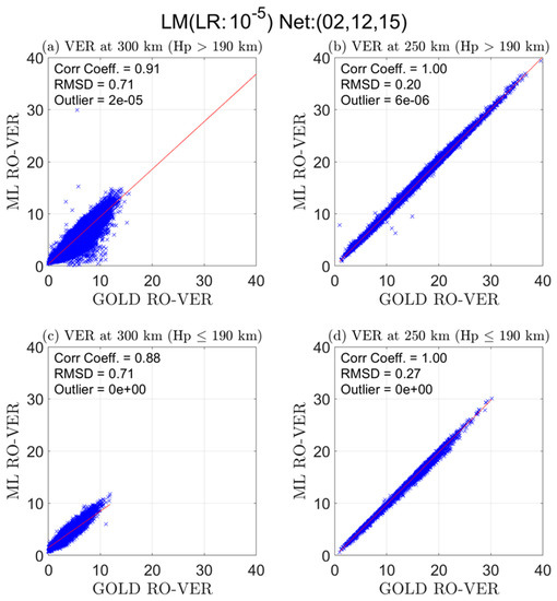 Having demonstrated the hand-picked nets trained with GDX and SCG, the LM Net:(02, 12, 15) was then selected and verified in Figure 10. It is worth noting that although the correlation coefficients of RO-VERs at 250 km altitude in the case trained by the LM algorithm (Figure 10b,d) were equal to 1.0, the RMSDs here were the largest compared to the same categories of GDX (Figure 8b,d) and SCG (Figure 9b,d) at the same altitude. In addition, Figure 10a illustrates that there is a small cluster of underestimated ML RO-VERs at 300 km altitude when the initial intensity is above 190 km altitude, and the RO-VERs dispersed the most in the case of LM among all algorithms applied in this study at both 250 km and 300 km altitudes. As for the RO-VERs at 300 km altitude but with the initial intensity below the 190 km altitude (Figure 10c), the correlation coefficient between GOLD and ML RO-VERs is 0.88, which is the lowest among Figure 8, Figure 9 and Figure 10 as well.