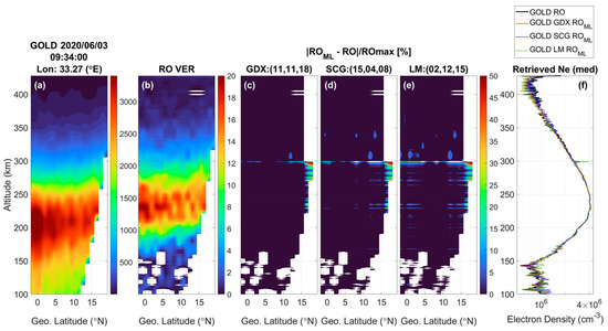 In particular, the discrepancy between GOLD RO-VER and ML RO-VER was calculated as a percentage of the GOLD RO-VER maximum () of each profile. The formula was given as , where denoted ML RO-VER, and denoted GOLD RO-VER. It can be seen that GDX Net: (11, 11, 18) generally had the fewest discrepancies among Figure 11c–e, and the discrepancies were mostly less than 5% except for the anomalies at the boundary on the right-hand side. In Figure 11f, it is shown that the median Ne inverted from ML RO-VERs of the GDX Net: (11, 11, 18) and SCG Net: (15, 04, 08) in the interval ranging from 180 km to 320 km altitude can show good consistency with the one inverted from GOLD RO-VERs ideally. On the contrary, the median Ne inverted from ML RO-VERs of the LM Net: (02, 12, 15) was found to have a large discrepancy with the one inverted from GOLD RO-VERs at 300 km altitude.