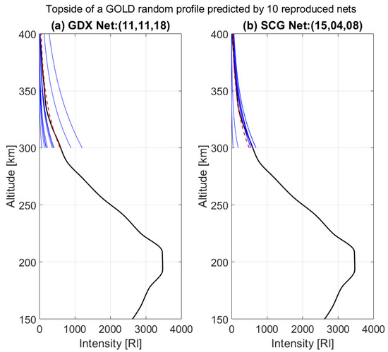 The black solid line in Figure 12 indicates the randomly selected GOLD 135.6 nm limb intensity profile, and the red dashed line in Figure 12a denotes the topside of the profile predicted by the GDX Net: (11, 11, 18) generated in the 8000 training loops, while the one predicted by the SCG Net: (15, 04, 08) was denoted in Figure 12b. Remarkably, the GDX Net: (11, 11, 18) predicted topside (red) matched the GOLD intensity profile (black) ideally, and the difference of the intensities at 300 km altitude was extremely small. Nevertheless, the topsides in blue predicted by the reproduced nets did not perform as well as the original GDX Net: (11, 11, 18).