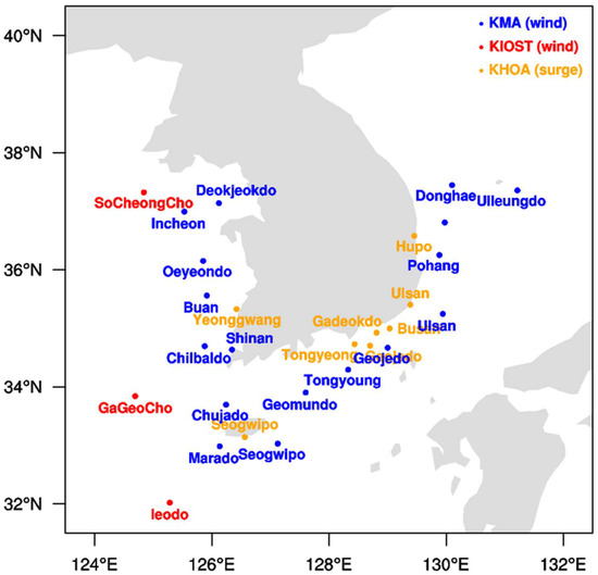 Observation locations of the KMA, KIOST, and KHOA from 2018 to 2022. The wind speed was observed in the KMA buoys (blue) and KIOST research stations (red). Orange dots indicate the KHOA surge height observation sites.