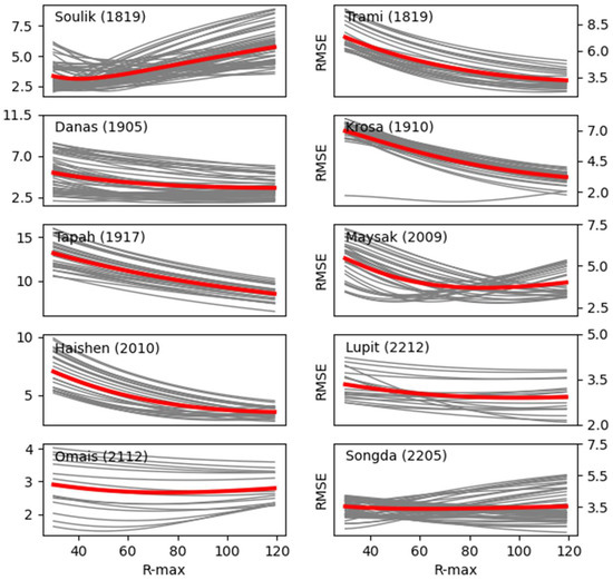 Figure 3 shows the root mean square error (RMSE) between the observational surface wind speed of each typhoon located north of 30°N and the parametric typhoon model outputs with the prescribed Rmax ranging from 30 to 120 km. The individual gray line shows the RMSE at every time step, and the red line shows the time average. The minimum value of the RMSE at each line was selected for the optimized Rmax. Consequently, the Rmax varied in each typhoon case and at each time step [33]. Here, the optimized Rmax tended to decrease when typhoons approached Korea due to a decrease in typhoon energy with a smaller horizontal size and weaker intensity in general. The Rmax was larger in the subtropics, when the typhoon was more intense and larger than that located at midlatitudes.