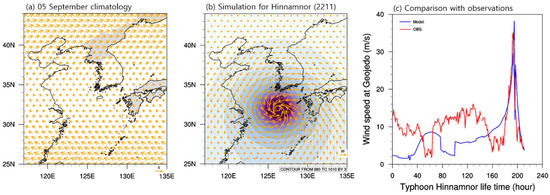(a) Daily climatological mean surface wind, (b) T-P model simulation for Hinnamnor (snapshot on 5 September). The reference vector shows 5 m/s in (a) and 20 m/s in (b). Wind speed simulation (blue line) and in situ observations (red line) at Geojedo are shown in (c).