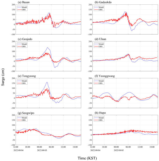 Surge model simulation results and KHOA observations at (a) Busan, (b) Gadeokdo, (c) Geojedo, (d) Ulsan, (e) Tongyeong, (f) Yeonggwang, (g) Seogwipo, and (h) Hupo from 4 to 5 September in 2022.