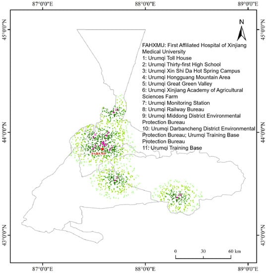 Location of environmental monitoring stations and hospital in Urumqi, Xinjiang. The location of each air quality monitor is marked with a pink dot; the location of the hospital is marked with a red cross; the home address of each recruited patient is marked with a green dot.