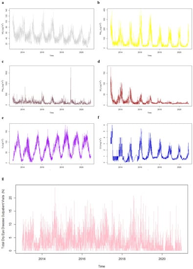 - Chen, R.; Yang, J.; Chen, D.; Liu, W.J.; Zhang, C.; Wang, H.; Li, B.; Xiong, P.; Wang, B.; Wang, Y.; et al. Air pollution and hospital outpatient visits for conjunctivitis: A time-series analysis in Tai’an, China. Environ. Sci. Pollut. Res. Int. 2021, 28, 15453–15461. [Google Scholar] [CrossRef] [PubMed]