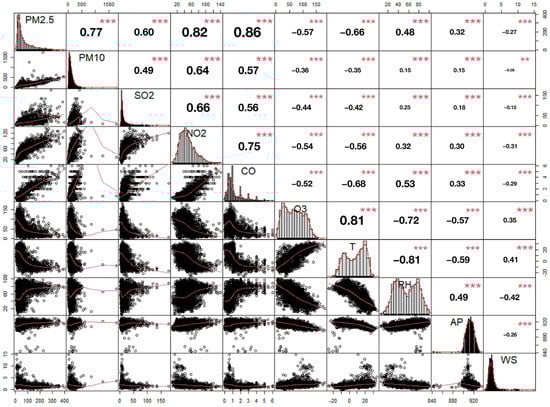 As shown in Figure 3, we reported correlations between the four main meteorological factors and six air pollutants by Spearman analysis, with the strongest correlation between PM2.5 and CO (r = 0.86, p-value < 0.0001) and a high correlation with NO2 (r = 0.82, p-value < 0.0001). The results showed that correlations between particulate matter and other gaseous pollutants or between different air pollutants were also present to varying degrees (p-value < 0.0001).