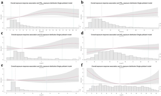 Overall exposure-response association for outpatient visits for DED and air pollutants: PM2.5 (a), PM10 (b), CO (c), NO2 (d), SO2 (e), O3 (f) in single-pollutant model.