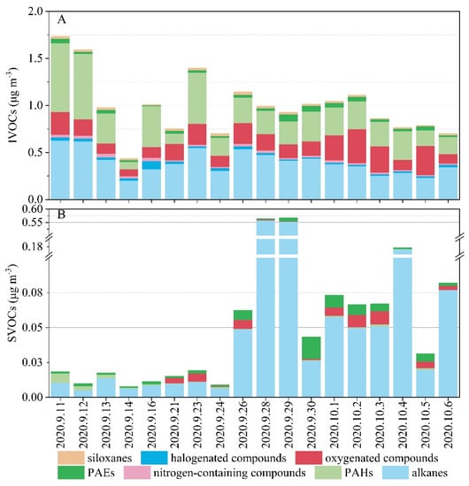 The concentration and composition of speciated IVOCs (A) and SVOCs (B) from 11 September to 6 October 2020 in Beijing.