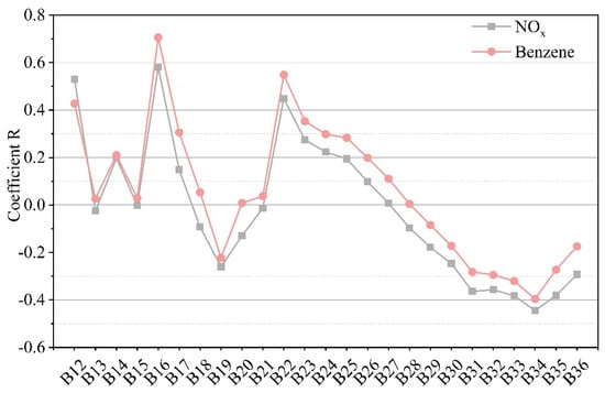 Harrison et al. [] used NOx as an indicator of diesel vehicle emissions, and the occurrence of NOX increased in a cold start []. Benzene was used to trace the sources of S/IVOC []. Correlations (coefficient R) between the S/IVOC (gas-phase and particle-phase) concentration, and NOx and benzene as a function of the carbon number are shown in Figure 2.